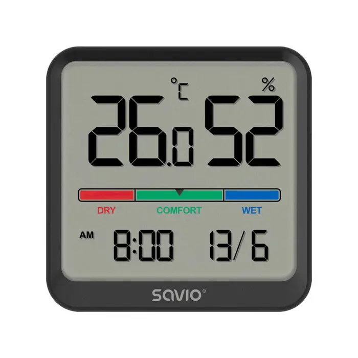 SAVIO Wireless weather station, temperature and humidity sensor, indoor use, LCD screen, clock, date, handle with magnet, CT-01/B Black