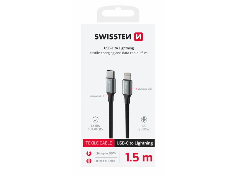 SWISSTEN kabel USB-C/Lightning TEXTILE II, 3A, 30W, 480 Mb/s, 1,5m crno-srebrni - 03080125