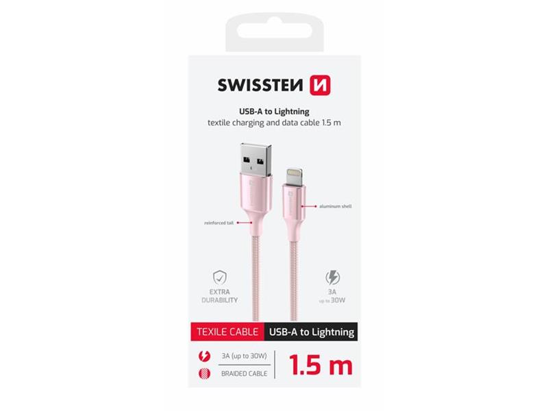 SWISSTEN kabel USB/Lightning TEXTILE II, 3A, 480 Mb/s, 1,5m rozi - 03080121