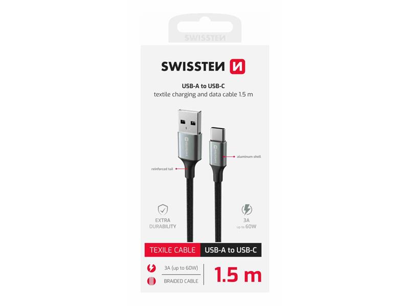 SWISSTEN kabel USB/USB-C, TEXTILE II, 3A, 60W, 480 Mb/s, 1,5m crno-sivi - 03080116